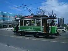 Similar collectors were also used at first on the nearby and slightly earlier Manx Electric Railway. They gave trouble initially with poor contact and so the slack wire system was developed. A tensioned wire usually gave a good contact but broke contact when the collector passed the pole. Slackening the wire and deliberately lifting it up clear of the collector at the poles allowed its weight to give a reliable contact over the other collector, spaced to be at the midpoint between poles. A revised collector was in use within the first few years, by 1900. A small hinged bow frame was placed on top of the fixed uprights, giving a sprung contact.[2] Bow collectors did not last though and were replaced with trolley poles.