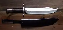 Since the first incarnation, the Bowie knife has come to incorporate several recognizable and characteristic design features, although in common usage the term refers to any large sheath knife with a crossguard and a clip point.[9] The knife pattern is still popular with collectors; in addition to various knife manufacturing companies there are hundreds of custom knife makers producing Bowie knives with different types of steel and variations in style.