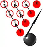 The objective in spinning is to depend more on pin deflection (pins hitting other pins) than "carry" (the ball knocking down the pins.) For a right-handed bowler, the ball proceeds down the lane, usually using a left-to-right line, and strikes the right side of the 1-pin. At this point, the ball will proceed to move down the front row of pins in the direction opposite its spin - the 1-3-6-10 pins. This type of a hit is referred to as "riding the rail" among spinners. A properly thrown spinner will hit the pocket in a way as if the ball was spinning away from the 1-pin. Conventional bowlers who watch this type of spin will actually think the bowler threw a backup ball, though any hook on the ball tends to be unintentional. As the ball moves down the row, it creates a domino effect. The 1-pin hits the 2-4-7, the 3-pin hits the 5-8 the 6-pin hits the 9, and the ball eventually hits the 10-pin alone. Even when the ball hits Brooklyn, the reversal of direction allows even more ball and pin deflection (known as "mixing"), allowing a higher chance of messenger strikes.