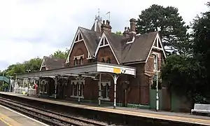 The station was constructed at the insistence of Thomas Grissell the owner of Norbury Park, in part compensation for the railway cutting across his land to the north of the village. The main building was designed by Charles Henry Driver[6] in the Châteauesque style and included steeply pitched roofs with patterned tiles and an ornamental turret topped with a decorative grille and weather vane.[7] The building is currently in use as a private dwelling and commercial premises and is protected by a Grade II listing.[1]