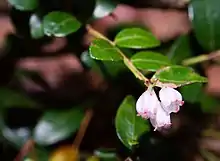 Box huckleberry is a low shrub, growing 6 to 8 inches (150 to 200 mm) tall.[4] Its leaves resemble those of boxwood (hence its name).[5] The leaves are about 1 inch (2.5 cm) long and oval-shaped.[6] They are glossy and minutely toothed,[5] turning red in winter.[4] The evergreen leaves, lacking resin glands, are in sharp contrast to other species of Gaylussacia.[7] Box huckleberry flowers in May and June.[6] The flowers are urn-shaped and white, sometimes tinged with pink. Like other huckleberries, the flowers appear on a raceme springing from the leaf axils.[4] Its fruits, which appear in July and August,[6] are blue berries borne on short pedicels.[8][9]