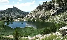 Box Lake is a glacial tarn in the Ruby Mountains, in Elko County in the northeastern part of the state of Nevada. It is located on a shelf on the side wall of Box Canyon, and at an elevation of 9,620 feet (2,930 m). Along with Snow Lake, it is one of the sources of the stream which flows down Box Canyon. After exiting the mountains it merges with other streams to form the South Fork of the Humboldt River.