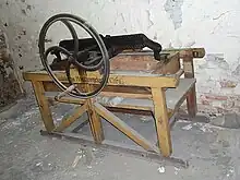 The box mangle is said to have been invented in the 17th century. It consisted of a heavy frame containing a large box filled with rocks, resting on a series of long wooden rollers. Damp laundry could be laid flat under rollers, or wound round the rollers: sometimes enclosed in a sheet in order to keep the laundry clean. When the rollers were filled, one or two people pulled on levers or turned cranks to move the heavy box back and forth over the rollers. The mangle's primary purpose was to press household linen and clothing smooth.[1][2]