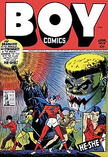 ![]() Boy Comics #9, featuring Crimebuster and Iron Jaw along with other characters appearing in the publication; art by Charles Biro | |