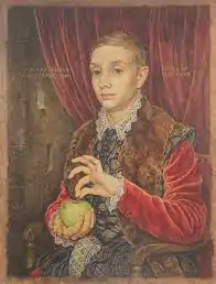 British artist Michael Taylor painted Boy with Apple in 2012 for use in the then-upcoming film The Grand Budapest Hotel. Taylor was contacted by director Wes Anderson, who requested a faux Renaissance-era portrait that would evoke imagery from European art history.[3] Anderson actively added his own input to the work; specifically, he asked that the painting be made along the lines of works by Hans Holbein the Younger and Elder, Bronzino, Lucas Cranach the Elder, and a number of Flemish and Dutch painters.[4][5]