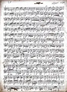 Pinchas Spektor Manuscript: Table of Contents- A manuscript book containing mostly compositions of Pinchas Spector (also spelled Spektor) is in the possession of his grandson, born Jehoshua Spektor in Leipzig, Germany, 1924. It appears that one of Pinchas's children (most likely his daughter, Sara), transcribed the music from his original scores. A scan of the table of contents from this collection is shown. To the left, written vertically, is a statement in Hebrew which translates as: "All entries from page 20 through page 175 I have copied from the original scores of my father, of blessed memory, Pinchas Spektor." An example image of one of the pages of music is also displayed.