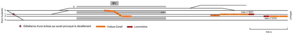 At 17:11 CEST (15:11 UTC) on 12 July 2013,[5] SNCF Corail Intercités train 3657 from Paris Gare d'Austerlitz to Limoges derailed and crashed at Brétigny station, resulting in the deaths of seven people (three passengers on the train and four on the platform) and injuries to "dozens" more. 385 passengers were on board,[6][7] and the crash occurred a few minutes after the train departed Austerlitz at 16:53.[8] It was scheduled to arrive at Limoges-Bénédictins at 20:05. The trains and platforms at Brétigny were particularly busy as it was rush hour and the Friday before the Bastille Day holiday weekend.[6]