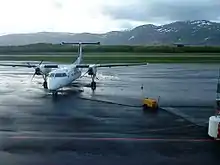 Widerøe is the only airline operating scheduled flights out of Brønnøysund,[26] serving it with their Bombardier Dash 8 aircraft. The services to Bodø and Trondheim are subsidized through public service obligations with the Ministry of Transport and Communications.[27]