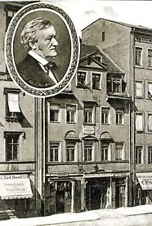 It was in the Brühl, in 1813, that the composer Richard Wagner was born[7] at no. 3, the 'House of the Red and White Lions'. Ironically, Wagner's disciple Theodor Uhlig, in an 1850 essay which Wagner was later to build on for his own essay Das Judenthum in der Musik, condemned the music of Meyerbeer by linking it to the Jewish quarters of Leipzig and Dresden: 'If that is dramatic song, then Gluck, Mozart, Cherubini and Spontini carried out their studies at the Neumarkt in Dresden or the Brühl in Leipzig.'[8]