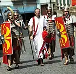 The city was described as prosperous by the poet Ausonius, in the 4th century.[5] Between 402 and 470 the Germanic Invasions of the Iberian Peninsula occurred, and the area was conquered by the Suebi, a Germanic people from Central Europe. According to records the city was protected by a wall, still in use since the 3rd century, and the old Roman theatre was repurposed into a fortress.[5] In 410, the Suebi established a Kingdom in northwest Iberia covering what is present-day's Northern half of Portugal,[6] Galicia and Asturias, which they maintained as Gallaecia, and had Bracara as their capital. This kingdom was founded by Hermeric and lasted for over 150 years. However, the departure of the Vandals and the arrival of the Visigoths brought a new instability to the region. Between 419 and 422, Braga was threatened by the Vandals so it prepared itself for a siege, closed its gates and refused to open them; this led to the destruction of the surrounding countryside.[5] Nevertheless, between 429 and 455, the Suebi made a military comeback in Iberia reinforcing their hold in Galeicia and Lusitania.[5] In 455, while the Visigothic king Theodoric II sacked Braga, utterly destroying many historical and archaeological records,[5] the Suebi king Rechiar escaped the city, wounded, to Porto.[7] However, records of a list of dioceses and parishes of Braga, made in 570 still exist.[5] By about 584, the Visigoths took permanent control of Gallaecia from the Suebi, and Braga was made a provincial capital.