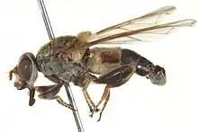 The scutum is opaque brownish grey; with two narrow, median, longitudinal, posteriorly somewhat divergent, shining brown stripes on the anterior two-thirds. There are broader, interrupted ones on either side with an area of the same color above the base of the wings. The humeri are reddish yellow The postalar calli reddish yellow The scutellum is reddish yellow, the latter with a similar pile to that on the thorax. The pleurae are almost all reddish, with sub-obscuring whitish pile pallidly brassy and subappressed.