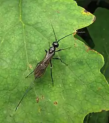 | Bracon brevicornis, female inserting ovipositor into paralyzed host. | |
