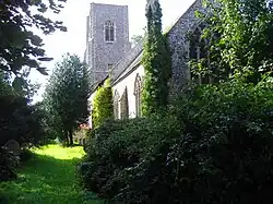 The porch is dated 1786, along with the churchwardens' names, which is probably shortly after the aisles were demolished.[7] At the east end of the church there is a decorated window and pentagonal buttresses with stone pinnacles added in 1864 when some restoration work was carried out on the church. Above the chancel arch there is a wall painting of Christ in Judgment. He sits on a rainbow showing his wounds. The wall painting dates from the 15th century.[8]