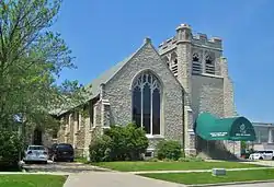 The church was designed in the Gothic Revival style. The limestone building sits on a differently-coursed limestone foundation. The main building has a prominent water table. The northeast corner of the church features a crenelated square tower. The double-door entrance, centered on the tower on the main facade, is in a pointed arch with stone molding. The rest of the building is a gable-roofed nave. The main facade of this gable features a large decorative leaded glass window. A small organ room was built on the north side of the building; this room was later used as a chapel and now serves as the minister's office and library.[3]