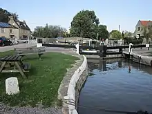 There are moorings above and below Bradford Lock. Next to the canal, a little way west of the lock, is a huge 14th-century tithe barn.[2] Beside the lock is Bradford Wharf where there are several historical buildings associated with the canal. The Wharfinger's House was the home of the Canal Company employee who managed the wharf. Across the canal was a gauging dock where canal boats were measured and weighed to determine toll rates.[3]