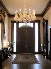 The house is two-stories and built on a T-shaped plan. The architecture is in the Greek Revival style with tall, spindly columns that are derivative of the Doric order around a three-sided veranda. The bracketed cornice indicates some Italianate influence, a fusion of stylistic elements that some have dubbed a "bracketed Greek Revival".[5] It contains fourteen rooms, with seven of those being bedrooms. The ground floor features 15-foot (4.6 m) ceilings.[6]