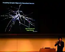 Synapses are the key functional elements of the brain.[11] The essential function of the brain is cell-to-cell communication, and synapses are the points at which communication occurs. The human brain has been estimated to contain approximately 100 trillion synapses;[12] even the brain of a fruit fly contains several million.[13] The functions of these synapses are very diverse: some are excitatory (exciting the target cell); others are inhibitory; others work by activating second messenger systems that change the internal chemistry of their target cells in complex ways.[11] A large number of synapses are dynamically modifiable; that is, they are capable of changing strength in a way that is controlled by the patterns of signals that pass through them. It is widely believed that activity-dependent modification of synapses is the brain's primary mechanism for learning and memory.[11]