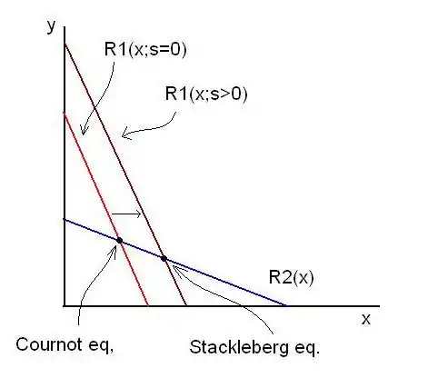 With no government subsidy (s=0) the resulting equilibrium will be the standard Cournot outcome, as shown in the graph by the intersection of the best response functions. A subsidy however has the effect of shifting the domestic firm's best response function to the right. Because its output is subsidized, the domestic firm increases production. This in turn means that the foreign firm's best response is to cut output, although not proportionally (hence, the market price falls). In the new equilibrium domestic firm produces more and foreign firm produces less.[4][5]