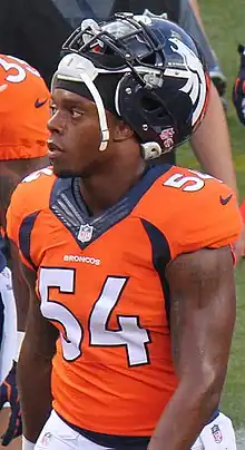 He started in the Denver Broncos' season-opener against the Baltimore Ravens and recorded seven combined tackles, deflected a pass, and sacked quarterback Joe Flacco in their 19–13 victory.[38] In Week 3, he collected a season-high 12 combined tackles (11 solo) during a 24–12 victory at the Detroit Lions.[38] On December 20, 2015, Marshall recorded seven combined tackles, a pass deflection, and an interception during a 34–27 loss at the Pittsburgh Steelers in Week 15. Marshall intercepted a pass by quarterback Ben Roethlisberger, that was intended for running back DeAngelo Williams, in the fourth quarter with the Broncos losing 34–27 with two minutes remaining. Unfortunately, the Broncos' offense were unable to capatilize and lost after going four and out.[39] Marshall started all 16 games and made 102 combined tackles (77 solo), four pass deflections, two forced fumbles, 1.5 sacks, and an interception.[15] He also finished second on the team in tackles.[40]