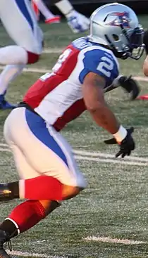 In his first two seasons in the league Whitaker was used a rotational back. In 2011, he took over the starting role from Avon Cobourne, and he made an immediate impact. Whitaker led the CFL in rushing with 1,381 yards on 226 carries.[2] He also added 638 receiving yards to surpass 2,000 yards from scrimmage and had six-100 yard rushing games.[3] Whitaker tore his ACL in September of the 2012 season, resulting in missing almost half the regular season.[4] Following the season Whitaker's contract expired and he attempted to sign with an NFL team, but eventually signed a new 3-year deal with the Alouettes in early June.[5] Early in the 2013 CFL season Whitaker suffered another injury, this time a separated shoulder, which resulted in him missing 13 of the 18 regular season games.[6] Whitaker played in the first 13 games of the 2014 season before landing on the 6-game injured list with a foot injury to wrap up the season.[7] Prior to the injury he managed to cross 1,000 yards from scrimmage for the third time in his career; earning an East Division all-star award.