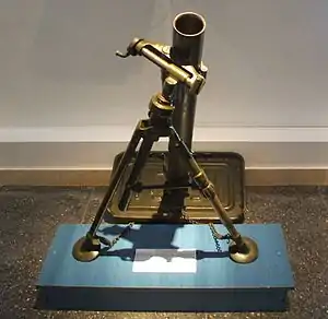 The Brandt mle 27/31 was a simple and effective weapon, consisting of a smoothbore metal tube fixed to a base plate (to absorb recoil), with a lightweight bipod mount.[14] The mle 27/31 could be disassembled into 3 loads, plus the ammunitions loads,[15] and a complete crew was 10 men. When a mortar bomb was dropped into the tube, an impact sensitive primer in the base of the bomb would make contact with a firing pin at the base of the tube, and detonate, firing the bomb towards the target.[16] HE and smoke mortar bombs fired by the weapon weighed 3.25 kilograms.[17]