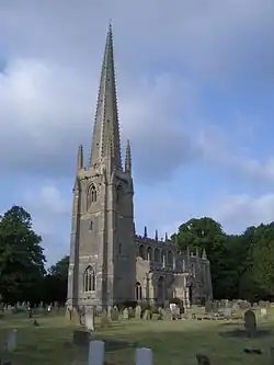 The Grade I listed Anglican parish church of St Helen,[3] which Pevsner describes as having "one of the most elegant spires of Lincolnshire".[4] Although restored between 1873 and 1876, it retains its 170 ft. high spire, an Early English nave, arcades and chancel arch, and Perpendicular vaulted porches and clerestory.[5]