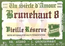 A 2006 ownership change tightened the brewery's market focus and expanded export markets. Seven products were retired and new packaging labels commissioned.[7] Brunehaut ships eleven labels across four continents, to more than twenty countries. Brewed as under 1000+-year-old Belgian brewing tradition, these beer styles feature Abbaye de Saint-Martin Dubbel and Tripel bottle-conditioned ales,[8] both Certified Belgian Abbaye Beers.