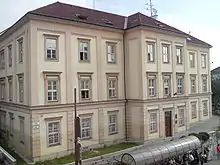 At first, the station also had freight loading and unloading facilities. One unique feature was the "vínovod" ("wine transport system"), which consisted of tubing from the station to the Palugyay family's wine cellars.[5] Gravity flow drew wine from trains into barrels in the cellars.[6] The station also had a ropeway conveyor to Patrónka (cartridge factory) which produced ammunition cartridges, colloquially known as "patróny". As passenger traffic increased, freight operations were progressively relocated to other stations in the city.