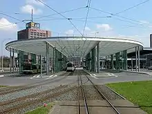 In 1999 to 2000, in preparation for Expo 2000, a local transport terminal was built in front of the station. The inauguration of the installation, which is protected against the weather with a 100-metre-long canopy, was carried out in May 2000. Simultaneously, the first tracks (with an additional standard gauge rail) were laid for the future standard gauge tramway in the area of the station. In local services, it was proposed that lines 1, 2, 3 and 10 of the RegioStadtBahn (regional light rail) would also serve the station, with work starting in about 2014,[9] although this is in doubt. Its first stage would connect the station and Braunschweig North station (Nordbahnhof) with Salzgitter, Goslar, Bad Harzburg, Schöppenstedt, Gifhorn and Uelzen. The RegioStadtBahn would use two unused platforms in the local station, which as yet have no tracks. The connection to the DB network would take place in the immediate vicinity with an on and off ramp from the embankment. In 2005, a new tram link on the Heinrich-Büssing-Ring was opened to the station. It connects the station with the suburbs of Heidberg, Melverode and Stöckheim in the south of Braunschweig. The new route to Stöckheim was commissioned on 15 October 2006.
