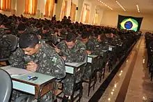 The Brazilian Army had a recorded personnel strength of 219,585 active personnel in 2014.[56] Another estimate by the IISS in 2014 put that figure at 190,000 active personnel, with 70,000 of those being conscripts.[2] In addition there were approximately 1,340,000 reserve personnel in 2014.[2] This figure was down from 1,800,000 reserve personnel in 2008.[57] In principle, the Brazilian Constitution designates the 400,000-strong Brazilian Military Police as a reserve force of the Army, although in practice they remain separate entities.