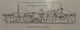 With a steel hull, she was powered by two four-cylinder diesel internal combustion engines coupled to two shafts/propellers, with a power of 1008 HP, allowing her to reach a speed of 13.5 knots. The ship had a gross tonnage of 4,872, and a cargo capacity of 3850 tons, measuring 115.21 meters in length by 16.37 meters in width and having a draft of 7.44 meters.[1][2]