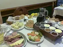 • Breakfast,¹ the café-da-manhã (literally, "morning coffee"): every region has its own typical breakfast. It usually consists of a light meal, and it is not uncommon to have only a fruit or slice of bread and a cup of coffee. Traditional items include tropical fruits, typical cakes, crackers, bread, butter, cold cuts, cheese, requeijão, honey, jam, doce de leite, coffee (usually sweetened and with milk), juice, chocolate milk, or tea.
