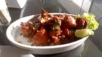 Some typical dishes are feijoada, considered the country's national dish,[6] and regional foods such as beiju, feijão tropeiro, vatapá, moqueca capixaba, polenta (from Italian cuisine) and acarajé (from African cuisine).[7] There is also caruru, which consists of okra, onion, dried shrimp, and toasted nuts (peanuts or cashews), cooked with palm oil until a spread-like consistency is reached; moqueca baiana, consisting of slow-cooked fish in palm oil and coconut milk, tomatoes, bell peppers, onions, garlic and topped with cilantro.