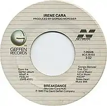 "Breakdance" is a song written by Giorgio Moroder, Bunny Hull, and the song's performer, Irene Cara. Moroder's obsession with the dance hit "Rockit" by Herbie Hancock fueled his composition of the music, and Cara was inspired by the street performers she saw growing up in the South Bronx to write lyrics about what was then called breakdancing. Released in March 1984, it was the third single that originated on her What a Feelin' LP and her first to make the top ten in the US since the album's title track went to number one almost a year earlier. "Breakdance" also charted in several other countries and had a dance remix that was also well received.