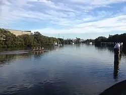 The heritage-listed Breakfast Creek Hotel is located near the confluence with the Brisbane River and is known for serving XXXX beer exclusively from wooden barrels.[3]