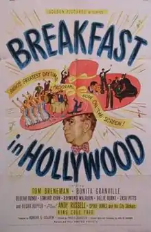 Breakfast in Hollywood, also known as The Mad Hatter, is a 1946 American comedy film directed by Harold D. Schuster and written by Earl Baldwin. The film stars Tom Breneman, Bonita Granville, Beulah Bondi, Edward Ryan, Raymond Walburn, Billie Burke, ZaSu Pitts, Hedda Hopper, Andy Russell, Spike Jones and Nat King Cole. The film was released on February 26, 1946, by United Artists.[1][2]