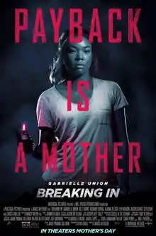 Breaking In is a 2018 American action thriller film[4] directed by James McTeigue and starring Gabrielle Union, who also produced the film alongside Will Packer, James Lopez, Craig Perry, and Sheila Taylor. The film follows a mother who must protect her children after the mansion of her recently deceased father is invaded by burglars.