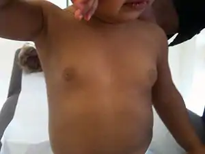 Thelarche, also known as breast budding, is the onset of secondary breast development, often representing the beginning of pubertal development.[1] It is the stage at which male and female breasts differentiate due to variance in hormone levels; however, some males have a condition in which they develop breasts, termed gynecomastia.[2][3] Thelarche typically occurs between the ages of 8 and 13 years with significant variation between individuals.[4][5][1] However, the initial growth of breast tissue occurs during fetal development.