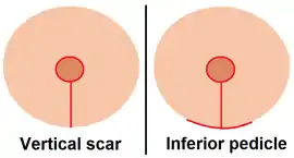 The inferior pedicle (central mound) features a blood vessel supply (arterial and venous) for the NAC from an inferior, centrally-based attachment to the chest wall.[21] The skin pedicle maintains the innervation and vascular viability of the NAC, which produces a reduced, sensitive breast with full lactational capability and function.[22] The volume and size reduction of hypertrophied breasts is performed with a periareolar incision to the NAC, which then extends downwards, following the natural curve of the breast hemisphere. After cutting and removing the requisite quantities of tissue (glandular, adipose, skin), the NAC is transposed higher upon the breast hemisphere; thereby the inferior pedicle technique produces an elevated bust with breasts that are proportionate to the woman's person. Nonetheless, breast-reduction with an inferior pedicle, occasionally produces breasts that appear squared; yet, the technique effectively reduces the very enlarged breasts of macromastia and gigantomastia.