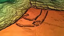 The 'Elephant Stone' is the largest of several large pieces of rock which lie in a hollow on the western margin of the summit plateau. It has been suggested that the hollow itself derives from the collapse of a cavern around 1800, the formerly larger stone would have then tumbled into its present position and broken up. Each of these stones is itself formed from smaller fragments of oolitic limestone, naturally cemented together by calcite and likely having gathered in an earlier cleft or 'gull' in the hillside. The King and Queen stones are of similar origin. The cambering which leads to the formation of gulls can be seen elsewhere on the unstable slopes of the hill.[3]