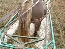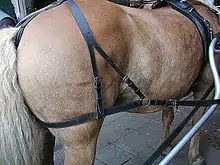 The breeching strap traces its roots back to the Chinese invented breast-strap or "breastcollar" harness developed during the Warring States (481–221 BC) era.[1] The Chinese breast harness became known throughout Central Asia by the 7th century,[2] introduced to Europe by the 8th century.[2] The breeching strap would allow the horse to hold or brake the load as horse harnesses were previously attached to vehicles by straps around their necks as previously designed harnesses would constrict the horses neck preventing the horse from pulling heavier loads.[3] The breeching strap acted as a brake when a cart tries to run forward when moving downwards on a slope and also make it possible to maneuver the cart in the reverse direction.[4][5]