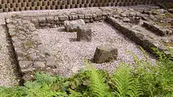 Several antiquarians recorded their visits to Ribchester, including John Leyland, William Camden, and William Stukeley.[11] Excavations began in the nineteenth century, with those undertaken by Thomas May and Donald Atkinson recovering the outline of the fort.[11] The granaries were excavated in 1908, including the discovery of a layer of charred cereal grain.[12] The Manchester Classical Association excavated part of the Principia in 1913, reported by Haverfield in 1914.[13] Private excavations were undertaken in 1967 of a bath house.[2] Excavations were undertaken in 1980 in the vicus.[14] Ribchester featured in series one of Time Team. Along with the archaeologists, the Ermine Street Guard were also present; they reenacted the construction of a turf rampart using authentic Roman tools.[15] The University of Central Lancashire undertook excavations during the 2010s in the area of the north gate of the auxiliary Roman fort.[16]