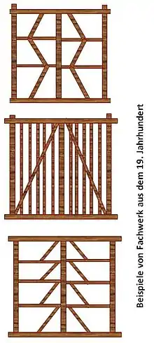 Two forms of farmstead predominated. On the one hand there was the unit farmhouse,[2] which was partitioned transversely and where, in most cases, the threshing floor was in the middle of the house; on the other hand there was the two-sided farm with the farmhouse on one side and outbuildings on the other. The main farmhouse was usually oriented in a north–south direction, but there were often variations in which the building was oriented northeast to southwest. When erecting the houses, builders appear to have taken account of the direction of the sun, in particular to ensure that the morning sun shone into the living rooms. As construction activity took place mainly in winter, outside the busy summer season, there was often a deviation in alignment. Very rarely, buildings oriented from northwest to southeast may be found.[3]