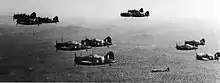 At Midway Island, United States Marine Corps fighter squadron VMF-221 operated a mixed group of 20 Brewster F2A-3 Buffalos and seven Grumman F4F-3 Wildcats.[67] They were originally assigned to USS Saratoga as part of a relief force bound for Wake Island, but were diverted to Midway instead after the force was controversially recalled on 22 December 1941. Wake Island fell on the following day.[68] The squadron first saw action on 10 March 1942 when a Kawanishi H8K "Emily" flying boat was shot down by Captain James L. Neefus near Midway, the Buffalo's first kill in U.S. service.[69][70][71][72]