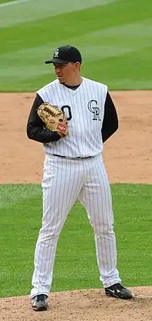 On December 16, 2001, Fuentes was traded to the Colorado Rockies, along with José Paniagua and Denny Stark for Jeff Cirillo.[1] Through the first four years of his Major League career, Fuentes had a record of 8–8 with a 4.04 ERA, recording only four saves in 163 games. However, in 2005, Fuentes took over the closer role for the Rockies following the season-ending shoulder surgery of right-handed pitcher Chin-hui Tsao. Fuentes had a successful season and was named to his first career All-Star Game, but did not appear in the game. He became the first reliever and only the third pitcher overall to represent the Rockies, joining starting pitchers Mike Hampton (2001) and Shawn Chacón (2003). His 31 saves matched Dave Veres (1995) for the third highest single season total in franchise history, trailing only José Jiménez (41 in 2002) and Chacon (35 in 2004). In 2006, Fuentes earned 30 saves while posting a 3–4 record and a 3.44 ERA and was selected as an All-Star for the second time. Fuentes got his first career postseason win in Game 3 of the 2007 NLDS when the Rockies won the series against the Phillies in 3 games. The Rockies would eventually make it to the World Series for the first time in franchise history but lost to the Boston Red Sox in the 2007 World Series in just 4 games.