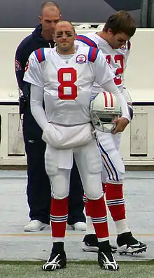 Axel Edward Brian Hoyer[1] (born October 13, 1985) is an American football quarterback for the Las Vegas Raiders of the National Football League (NFL). Since joining the NFL in 2009 as an undrafted free agent, he has started for seven different teams, the second-most in league history. Hoyer's longest stint has been with the New England Patriots for eight non-consecutive seasons, primarily as a backup, and was a member of the team that won Super Bowl LIII. His most successful season was with the Houston Texans in 2015, who he helped lead to a division title.