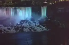 Bridal Veil Falls is the smallest of the three waterfalls that make up Niagara Falls. It is located on the United States side in New York state. Luna Island separates it from the American Falls and Goat Island separates it from the Horseshoe Falls. Bridal Veil Falls faces to the northwest and has a crest 56 ft (17 m) wide.
