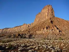 Bridger Jack Butte is a sandstone butte located in Bears Ears National Monument, in San Juan County, Utah, United States. Set at the northern tip of Bridger Jack Mesa and above the confluence of Indian and Lavender Creeks, the summit rises to an elevation of 5,890 feet (1,800 meters), and towers over 700 feet (210 meters) above the surrounding terrain and floor of Lavender Canyon to its west.[3] This landmark is situated four miles southeast of the Sixshooter Peaks, and is visible from State Route 211 between Newspaper Rock and the Needles District of Canyonlands National Park. "Bridger Jack" was a Paiute medicine man.[4]