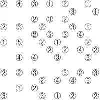 Hashiwokakero is played on a rectangular grid with no standard size, although the grid itself is not usually drawn. Some cells start out with (usually encircled) numbers from 1 to 8 inclusive; these are the "islands". The rest of the cells are empty.