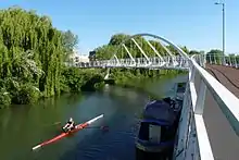 This foot and cycle bridge connects Chesterton and Riverside near the Museum of Technology.[12] Construction work began in April 2007, and the bridge opened to the public on 5 June 2008.[13] It cost £3.1 million and was partially funded by Tesco to provide increased access to its Newmarket Road store.[14] In 2022 it was renamed to honour writer and abolitionist Olaudah Equiano who had links to the Cambridge area.[15] map 18a